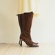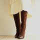 - /羊猄及膝長靴/ 本季細緻的羊猄皮革元素 局部拼接牛皮感 扁粗跟舒適好走視覺上也不厚重 搭配簡約的連身衣 簡單的一套穿搭 上班和約會都優雅時髦 略寬的筒圍除了顯瘦小腿 或搭配褲裝也非常方便 整體拉長身型線條的及膝長靴
