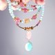 **◈設計師怎麼說** 天河石如海水一般的色調很舒心。 此款嚴選顆顆冰潤的天河石,搭配濃豔、冰透的草莓晶,相襯頂級星光粉晶貔貅,體現頂級華麗的美感。 堅持嚴選、精工手作本件單品,只為幫獨一無二的作品找到懂得寶石並珍惜的你(妳)。 **僅此一件,等待主人的出現。** **108手串的新概念** 傳統觀念裡,108手串是佛珠、佛教徒才使用,這樣想就太落伍囉:p 108手串確實源自佛家經典,也因其長度,得繞手腕好幾圈、或戴脖子當項鍊。但時至今日,108的材質、造型、裝飾用途等隨時代進步、改變,更為時尚、多層次、百搭,設計師也必須配合使用者喜好做調整,編製獨一無二的客製作品。 再者,**108從來就非專屬佛教徒,即使不是佛教徒,也能接受108吉祥的意涵、與多層次的搭配效果**。 我們常常與客戶分享,108手鍊乃身外之物,不論我們是否為佛教徒,念佛誦經或祈禱主要是內心,**不被物所繫、被物所礙**,更不要被困在手上的手鍊是什麼質料、要多少顆數、 要如何掐捻、要拿在左手或是右手。 人們持珠宜求方便、自在,正如「金剛經」所述:「凡所有相皆是虛妄,若見諸相非相,即見如來」,手鍊、念珠也是相之一,所以使用時不宜過份計較它,**一切以舒適為宜**。 **108念珠緣由** 108顆念珠代表108種煩惱,即六根的眼、耳、鼻、舌、身、意之中各有苦、樂、捨三受,六根之中又有好、惡、平三種,合為18種共計為36種,最後加上時間的過去、現在、未來三世。 108種煩惱,意思是眾生的煩惱有108種,煩惱能生種種惡業。故要斷除,斷除一百零八種煩惱,從而使身心達到一種寂靜的狀態。佛珠戴在手上,就是時時刻刻提醒我們要學佛菩薩的慈悲。在任何環境時候都能保持平穩不急不躁的寬裕心態。 藏文中,念珠叫「長瓦」,有惦念、想念、憶念的意思,也有相續不斷的意思。代表恆常不斷地憶念上師、本尊、空行、護法;也指上師、本尊、空行、護法恆常不斷地垂念於我,賜予悉地和智慧。 **天河石** 天河石(Amazonite)是一種很年輕的寶石,發現於上世紀70年代,閃現著宛如河水般澈藍的光澤,亦有亮綠至亮藍綠的品種,閃現半透明的光影,相當迷人。 在古老的傳說中,天河石具有帶來財富的魔力,故被稱為「幸運之石」,能幫助人們帶來運氣和信心。 **草莓晶** 草莓水晶(Strawberry Quartz)是近年被發現的新礦石,又稱士多啤梨晶(粵語中草莓的的別名),因其外觀滿佈紅潤的礦物(纖鐵礦)而呈現粉色調,如同草莓的色彩與果籽一般而得名。 草莓晶的光澤相當艷麗而優雅,隨環境的光線而閃現不同程度的光彩,尤其於戶外陽光下,能見到她最真實的美。 草莓晶可以開發心輪,主愛情與人際關係。能增強愛情運勢、吸引美好的姻緣、增進人際關係的和諧友善。 **粉晶** 粉晶(Rose Quartz)亦稱作薔薇水晶、芙蓉晶,呈現六芒星光者為上品,相當稀有。 希臘神話記載,愛神阿佛洛狄忒給了幼年帕里斯一條粉晶手鍊,帕里斯長大後,率領龐大的艦隊到斯巴達交涉,遇見當時世界上最漂亮的女子海倫,而海倫也被俊美的帕里斯王子迷醉得不能自制。後帕里斯將海倫帶回了特洛伊,舉行了隆重的婚禮,成為夫妻。因此,人們認為薔薇水晶能招來好人緣與愛情。 **六字真言** 六字真言(六字大明咒),源於梵文,由六個藏文字組成,即嗡嘛呢唄美吽(梵語:Oṃ Maṇi Padme Hūṃ;藏語:ཨོཾ་མ་ཎི་པདྨེ་ཧཱུྃ),是佛教裡最常見的真言。 此咒含有諸佛無盡的加持與慈悲,是諸佛慈悲和智慧的音聲顯現,其內涵異常豐富,奧妙無窮,蘊藏了宇宙中的大能力、大智慧、大慈悲,常誦具有不可思議的功德和利益。 嗡嘛呢唄美吽,每個字代表的含義皆不同: 嗡(Oṃ)-能除傲慢心;凈除我執。 表示佛部心,象徵白色的平等性智光,除盡我執與傲慢。亦表佛心,代表法、報、化三身,是所有諸佛菩薩的智慧身、語、意。 嘛(Ma)-能除嫉妒心;凈除忌妒。 表示綠色的智光,除凈阿修羅道中的忌妒,能消除非人鬥爭苦。 呢(ṇi)-能除貪慾心;凈除無明。 表示黃色自生本智光,除人間生老病死之苦,凈除人道中之無明及貪慾。 唄(Pad)-能除愚痴心;凈除愚痴。 表示藍色法界體性智光,能消除畜生勞役之苦,消除愚痴。 美(me)-能除吝嗇心;凈除慳吝。 表示紅色妙觀察智光,能消除餓鬼饑渴苦,凈除餓鬼道中之慳吝。 吽(Hūṃ)-能除瞋恚心;凈除瞋恨。 表示金剛部心,象徵黑藍色大圓鏡智光,能消除冷熱地獄苦,消除瞋恨。 常念誦唵嘛呢叭咪吽六字真言,能夠消除貪、瞋、痴、傲慢、嫉妒以及吝嗇這六種煩惱,超脫六道輪迴,往生凈土而證菩提。 **貔貅** 貔貅(ㄆㄧˊ ㄒㄧㄡ)為龍頭、馬身、麟腳,形似獅子,為中國傳說的一種祥瑞之獸,能轉禍為祥,帶來歡樂及好運。 從古至今,舉凡皇宮貴族、平民百姓,都極度喜愛收藏和佩戴貔貅,相信貔貅能開運、辟邪,並招財、鎮宅、化太歲、促姻緣等。 古時候,貔貅形象精壯結實、兇猛威武,近代亦不乏圓潤、討喜萌樣之貔貅,更受現代年輕人的喜愛與收藏。 **◈嚴選素材、用心把關** 材質:天然天河石、星光粉晶、草莓晶、琉璃、18K金、925銀 尺寸:珠直徑4mm,繞4圈手圍直徑為5.5cm,**手圍可與設計師溝通調整**。 **◈期待唯一的您與之相遇** 我們向您保證,這是一件單品,非大量生產。 如需復刻或量產,品味非凡的您一定理解,因為純手工精製,每件作品無法100%相同,但我們會努力讓風格一致,請給我們一定的時間醞釀每一件佳