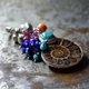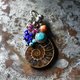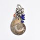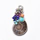 アンモナイトと繊細シルバー装飾ターコイズ、たわわな鈴とターコイズ&ラピス&ルビー、チベタンコーラルを繋いだペンダントトップです。