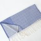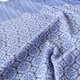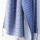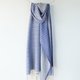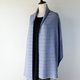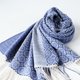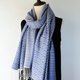 やわらかなアイボリーの糸をベース織りに、鮮やかなグレイッシュブルーの糸で柄を織り出しています。日本の伝統色では薄群青色に近いとても綺麗な色合いです。織柄の中にアクセントとしてダークネイビーのボーダーを入れています。布幅の四分の一ほどは織柄を変えて色の出方にも変化をつけているので、纏い方でいろいろな表情を楽しんでいただけます。春や秋はトップスやコートの代わりに、夏は冷房対策や日差し除けに、冬には首元に小さく巻いてマフラーのような纏い方がおすすめです。シルク混なので上品な光沢と華やかさがあり、フォーマルな場にもお使いいただけます。