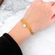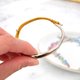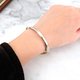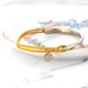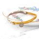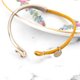 - 來自巴黎品牌 Les Cleias 的手鍊,一邊為銀色金屬,另一邊為黃色皮革製造。金屬部分有一個小鉤,只要將黃色皮繩繫上就能固定,另有一個小小的銀圓牌刻有品牌標誌。