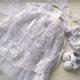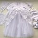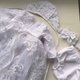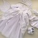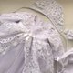 Baptism dress with lace, pearls, sparkles and ribbon, panties, bonnet, headband, bib and booties for girl or baby girl. If you need blanket or jacket for this outfit, I can make it in order. Your girl will have a great look in this gown.