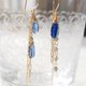 カイヤナイトに2種類のチェーンとラブラドライトのフリンジを添えたピアスです