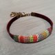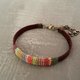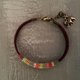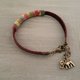 A thin friendship mens bracelet made out of 0.2" (6 mm) wide distressed brown leather ribbon, fine crochet with cotton threads in greens, orange, grey, yellow and beige. Bronze tone ends, lobster clasp closure with chain extender and indian elephant charm.