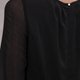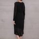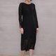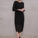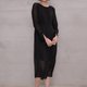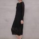 霧面紗與金屬蔥紗交織出細膩的光澤,領口妝點局部細皺,搭配提高的腰線襯托出女爵般的優雅身段。裙身半透明和外側開衩的設計讓內斂簡潔的夜黑洋裝神秘中帶著柔美,不慍不儒的襯托著有如絕世名伶般與生俱來的高雅氣質。