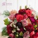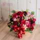 使用花材:紅玫瑰、蒙瑪特紫玫瑰、酒紅康乃馨、奶茶康乃馨、桃紅康乃馨、紅松蟲花、酒紅洋桔梗、非洲鬱金香、蕾絲花、扁柏、梔子葉。