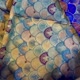 《錦浪澐藍》使用的織錦緞布料,以多層扇形紋理交錯鋪陳,像細緻羽片堆疊,也像水面被風掀起後留下的漣漪。深藍、湖青、淡金與古銅色等線紗交錯織成,使布面在不同角度下呈現金屬般的亮面與陰影變化,視覺層次非常豐富。