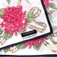 Lovely vintage handkerchief featuring blooming pink Hydrange arranged around a check-pattern ribbon as frame, black border. Soft, airy woven cotton with an elegant touch of British charm — perfect as a wearable accent or collectible piece.