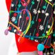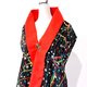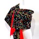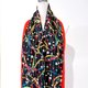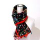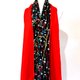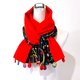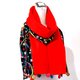 這是一件雖然是二度空間卻呈現著三度空間感的溫暖、柔軟的作品。好似一個快樂女巫揮舞著魔杖,先端噴射出黑色的夜空與多彩的緞帶,漫天的星光舞動,讓人想恣意穿梭翱翔,耳邊似乎能聽到爽朗的笑聲。另一面飽滿紅色的初剪羊毛(virgin wool),柔細又溫暖的觸感平衡著另一面的熱鬧繽紛,末端點綴著扁扁的多彩大圓珠,呼應著圍巾上自由奔放的彩色緞帶,不僅豐富了視覺,連心靈也得到暖暖的撫慰。整件作品由純棉、羊毛組成,冬天圍起來輕柔溫暖。