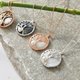 將樹枝綻放的姿態巧妙的將天然養殖淡水珍珠鑲在樹梢上。鮑魚貝的七彩霓虹作為背景顏色。巧妙的將自然意象及兩種不同的材質融合成為美景