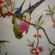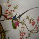 本作品落款為:「含情欲語前,紜事怕有風聲,似虎狂,癸未春余瀚青,擬郎世寧 畫意」,加蓋鈐印:「翰青印」,本瓷板畫是「癸未春」燒製,即1943年春天桃花盛開之際,余翰青正值39歲壯年之作,釉面畫一棵桃樹,樹枝上枝繁葉茂,色彩豔麗,粉紅色的小花非常吸引動人,象徵着春天的來臨。兩隻鸚鵡駐足枝頭,神態逼真,蠢蠢欲動,鸚鵡遍體披覆五色錦羽,余翰青以工筆將鸚鵡身上的羽毛逐一填色析出,以漸層的堆疊做出細膩的絲毛感,工筆細膩,線條細如髮絲,濃淡相宜,枝幹用濃墨描形、擦出樹皮紋理與樹瘤眼,所繪花卉明朗潔淨,設色幽雅,形象逼真。余翰青極重寫生,因而筆下的禽鳥帶有特殊的文人氣韻,典雅脫俗,整個畫面頗有生機意趣,融畫理筆墨於工藝技巧之中,靈活而工謹,係屬精品!