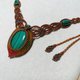 這件編織項鍊以大地色的蠟線為主軸,搭配孔雀石獨特的紋路,編織出向上延伸的對稱花紋,主石周圍搭配漸層色的線材,從紅到綠自然過渡,為整體添加色彩變化與生命力。