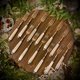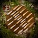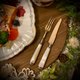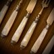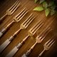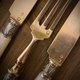 - 美麗的刀叉組,使用面是華麗的純銀鍍金,上面有品牌DR及純銀Minerva印記,手柄的設計也非常精緻,除了連接的精緻的浮雕銀頸環外,還有一個莨苕葉浮雕的銀套封底,手柄是珍珠母貝,散發美麗的珠光,整體精緻而華麗。