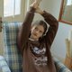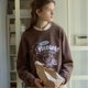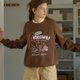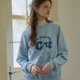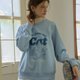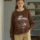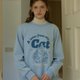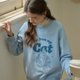 - 圓領落肩貓咪印花大學T - 藍色/咖色