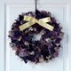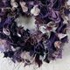 深みのあるパープルを基調に、さまざまな布片を丁寧に結んで仕上げた、表情豊かなファブリックリースです。