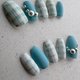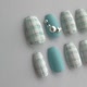 - マットな水色と白ツイードに大きめパールをアクセントに。 ネックレスのように輝き、上品で高級感のある指先に。 サイズオーダーでの受注生産です。ご購入から10日前後で発送致します。