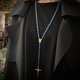 串珠以藍色多面切割玻璃製成,在光線下折射出耀眼光芒,典雅而莊重。十字架為鍍銀材質,背面刻有 Lourdes 字樣,充滿信仰意涵。