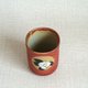 この作品は、信楽の土を使いろくろで作った湯のみに少しづつ加彩し焼成を重ねています。独自に調合した釉を用いて椿を丁寧に手描きしています。軽くて持ちやすく口当たりも滑らかです。赤絵付は均一にせず手仕事の温かさが感じられるようにしています。金や銀を使っての絵付けは技術的に難しく、作業時の温度・湿度管理に気を遣い仕上げています。