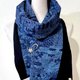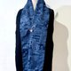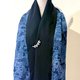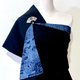 這件作品以傳統織布工藝製成的絹紬為主角,深邃的藍與黑交織出優雅細緻的日式圖騰,閃現細微而內斂的光澤。初見它,立刻讓人想起谷崎潤一郎在《陰翳禮讚》中那句經典——