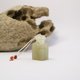 丹東石產於遼寧,整體呈綠色且透明,石質水潤。上頭雕有太湖鈕,以及綁繩串珠等裝飾,為做印鑑章之上品。