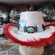Add a touch of charm and whimsy to your outfit with this handcrafted white Leather cowgirl Hat, beautifully accented with a soft red faux-fur brim and a western beaded hatband. This unique piece blends western style with feminine elegance, making it the perfect statement accessory for festivals, cosplay, themed events, photo shoots, and collectors of handmade leather hats.