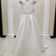 一款優雅的象牙色緞面曳引地長裙。修身的上身設計,V領,精緻的短泡泡袖上點綴著小巧的花朵貼花。腰間飾以精美的蕾絲刺繡和串珠細節,勾勒出曼妙的身姿。裙擺採用光滑挺括的緞面面料,精緻的褶襉營造出優雅飄逸的輪廓。
