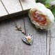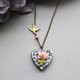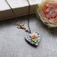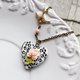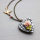 This beautiful necklace features a pretty white filigree heart locket decorated with a lovely pale pink rose cab and brass gold flying sparrow. It hangs from an antique brass flat cable chain.