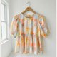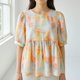 This round-neck top features a gathered hem and charming doll sleeves. A single button fastens the back.