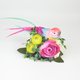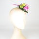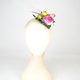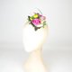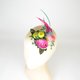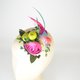 Sinamay base complemented with a feathered bird in pink and blue, green apples and silk flowers in bright pink and lime green.
