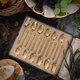 這一款非常特殊,訂製的落款,落款在匙面上,雖然沒辦法解析落款何字,但字體非常的優美,匙柄的形式也別於以往的扁平狀,而呈現四面方形,柄四面上呈現滿滿細緻的雕刻,匙面上有法國純銀Minerva及品牌印記,非常難得他有完整的原始盒裝,且盒上也有訂製者落款,非常值得珍藏。