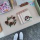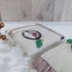 .主布為日本羊毛布,上面的圓形玫瑰花是布料本身的緹花圖案。拼接日本先然條紋布,增添獨特的層次感。綠色和金色葉片是手工一針一線鉤織及刺繡上去的喔!