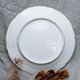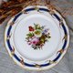 1756年,法國國王路易十五在賽佛爾(Sèvres)設立了法國王室的官窯,為自己與顯貴人士製造瓷器,而在十八世紀七0年代後,巴黎地區也出現了不同的民窯,有的甚至獲得貴族的贊助,採用賽佛爾的造型與裝飾圖案,甚至也聘請賽佛爾的藝師操刀,發展出所謂的巴黎窯產品。這些巴黎窯產品有的有其特製的落款,但也有許多沒有落款的產品。我們這組瓷盤(六客)便無落款,從花環、金邊與花卉的圖案來判斷,為賽佛爾窯廠常見的裝飾與色彩,應為巴黎窯的產品。中央的花卉繪製典雅細緻,寫真傳神,出自巧匠之手;盤緣金邊與花環飾帶,同樣考究,藍色滾邊點出這組瓷盤與法國官窯賽佛爾的淵源。
