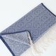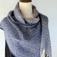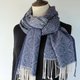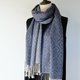 やわらかなアイボリーを経糸に、グレイッシュトーンのプルシアンブルーを緯糸に、細やかで複雑な柄を織り出しました。日本の伝統色では深縹色に近いとても綺麗な色合いです。表と裏で織柄と色の出方が変わるので、纏い方でいろいろな表情を楽しんでいただけます。ふっくら柔らかくとても温かいので、春や秋はトップスやコートの代わりに、冬には首元に小さく巻いてマフラーのような纏い方がおすすめです。シルク混なので上品な光沢と華やかさがあり、フォーマルな場にもお使いいただけます。