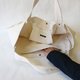 オーソドックスな形のトートバッグ。丸く縫い留めた持ち手は丈夫で手になじみます。口が広く荷物の出し入れがしやすく、マチもたっぷりでA4サイズも余裕で入ります。軽くて使いやすい大容量のショルダーバッグです。