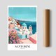 《聖托里尼藍白海岸 Santorini Blue Horizon》以明亮純淨的色彩描繪希臘最著名的愛琴海景致。畫面中藍頂教堂與層疊的白牆錯落於懸崖之上,前景粉色花叢綻放,遠方海天一線,構成一幅令人心醉的地中海畫面。