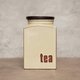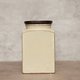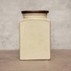 帶有簡約風格的茶葉罐來自英國於20世紀下半葉製造,罐身由陶製成並搭配木頭材質的蓋子,蓋子沒有橡膠無法達到密封的功能,底部有原主人貼的布膠以防止刮傷木頭表面。