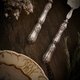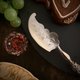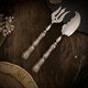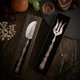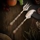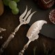 美麗的法式餐具,設計的風格採Art nouveau,這是一組特殊造型的刀叉組,刀子是多功能刀具,可以用來切割點心,也可以當成果醬奶油抹刀使用,叉子則是海神叉造型叉面,中間有花卉浮雕及十字鏤空,使用面的材質為鍍銀,手柄是純銀,有法國純銀Minerva印記,上面有非常華麗的植物曲線,整體精緻典雅。