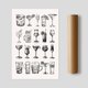 《經典酒杯 Vintage Glassware Collection》以細膩黑白插畫風格,描繪各式經典酒杯與調酒容器,從香檳杯、馬丁尼杯到威士忌杯與啤酒杯,每一筆線條都蘊含細緻工藝。