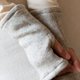表地は淡いヤク混グレー色のあたたかいスウェットガーゼ生地、裏地はオーガニックコットン100%の起毛布でとても柔らかで温いです。