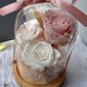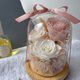 材料80%永生花,20%乾燥花搭配製成,搭配松木底座玻璃鐘罩。