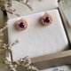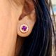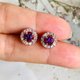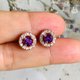 - Stud earrings with a halo design, featuring a 4 mm round-cut amethyst surrounded by white zircon.