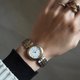 ラウンドケースにゴールドのベゼルを組み合わせ、柔らかな光を映す端正な構成。