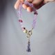 **薰衣草紫水晶**精工雕製10只**龍龜(十全十美、榮譽歸來)**,龍龜前安排**金鑽球**,象徵**龍戲珠(光明)**之美意,鍊身編以閃耀**紅碧璽**鑽面水滴,鍊首一端編有**堇青石**流蘇,使鍊身設計溫婉動人、也有助配戴。