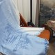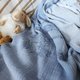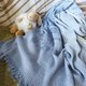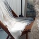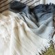 這全棉圍巾, 以色織條子排列疏密的技巧, 由右至左造成由黑至白的漸進視覺效果, 并刺繡了一幅好友相約觀山望水見兩月的故事, 詩意盈然. 整條圍巾以天然皺的材質處理. 讓產品跟著你隨心隨意, 不拘小節.
