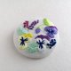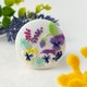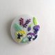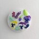 白の布地に黄色、白、紫のビオラを刺繍したくるみボタンのブローチです。