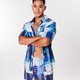 海人,男子傳統服裝為橫條紋背心與丁字褲,而女子則為直方紋巾與裙;簡樸的白底藍條配色透過繁複手織工藝,暗藏幻變飄渺的織紋。取其傳統紋路,再加入海浪、斧形飾品、編織魚網等符號,記載達悟祖先靠著辨識星星、風向、潮流的過人智慧與膽識,航向南方開啟海上貿易的歷史篇章。