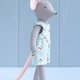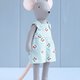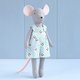 This pattern includes step-by-step photo instructions and full-size pattern pieces to make a mouse doll. The mouse is wearing loose knee length overalls. The overalls are fully lined, close in the back with a hook and loop tape and in the front with snaps. It's very easy to put the overalls on and off. The face is hand embroidered. The doll does not stand without support.