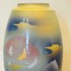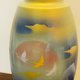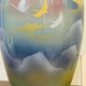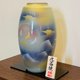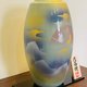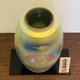 長山造是九谷燒名家,作品以輕柔色系和花草圖案及精湛手藝創造出飄逸美感。本件作品先繪上富有層次、暈染感的藍色天空,再於花瓶正中間繪上紅色的太陽,在紅色太陽前的是金色與銀色的鶴群,並以金銀兩色細緻描摹出銀色山脈及金色雲霧,非常自然和諧。