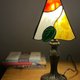 這盞檯燈打破傳統花卉圖案,以抽象幾何色塊勾勒出葉片意象,綠葉在橙紅與鵝黃的溫暖底色上閃耀,搭配乳白玻璃,強烈對比卻和諧,像陽光穿過樹梢,落下一片片色彩斑斕的影子。