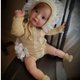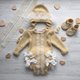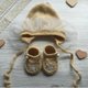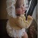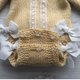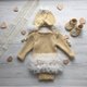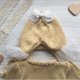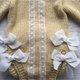 Hand made knitted clothing set for baby girl. Romper with lace, pearls and tulle, hat and booties. Can be as take home outfit, baby shower gift, birthday set, baby”s pictures gown.